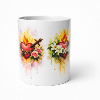 Keramička šalica s motivom Presvetih srca, Isusovo, Marijino i Josipovo, snažan je i dojmljiv svakodnevni podsjetnik na Kristovu ljubav, žrtvu i milosrđe. Umjetnički prikaz Srca okrunjenog trnovom krunom, iz kojeg izlazi plamen te nad kojim se uzdiže križ, vjerno slijedi tradicionalnu katoličku ikonografiju.