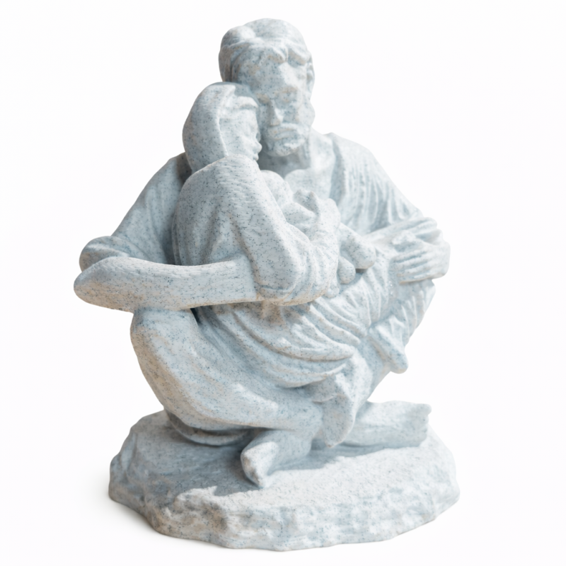 Kip svetog Josipa s Djetetom Isusom u naručju visine 15 do 35 cm. Sveti Josip je jedan od najvažnijih svetaca u kršćanstvu, poznat kao zaštitnik obitelji i radnika. Kipovi koji prikazuju svetog Josipa s Djetetom Isusom simboliziraju očinsku ljubav, zaštitu i brigu. Ovi kipovi često se koriste u crkvama, domovima i vjerskim institucijama kao simbol vjere i pobožnosti. Bijele boje u imitaciji mramora.