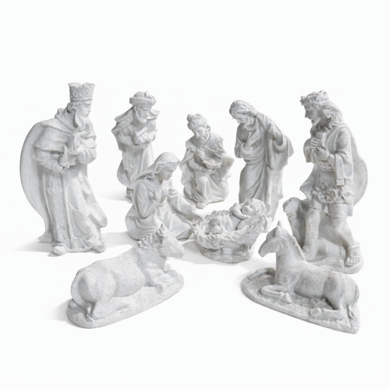 Ovaj prekrasan set jaslica sadrži 9 detaljno izrađenih figurica koje prikazuju svetu obitelj i trenutak Kristova rođenja. U središtu je maleni Isus u jaslama, uz Njega su Blažena Djevica Marija i sveti Josip, a tu su i pastir, Tri mudraca te životinje koje tradicionalno prate božićnu scenu.