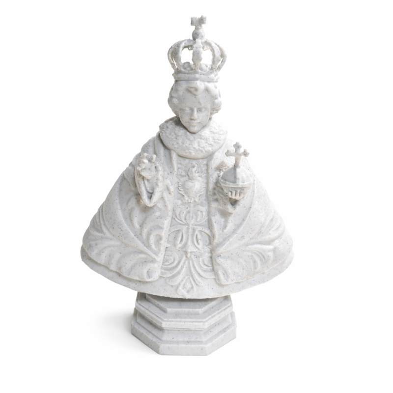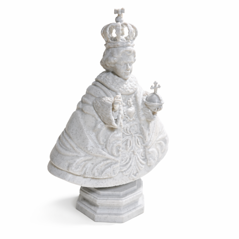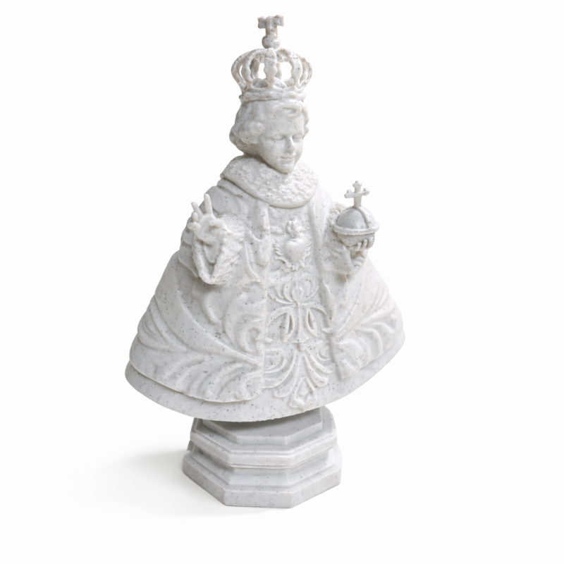 Ovaj kip prikazuje Dijete Isusa iz Praga, jedan od najpoznatijih prikaza Djeteta Isusa u katoličkoj tradiciji. Model je izrađen modernom 3D tehnikom, a svaki detalj — od krune i lica do bogato stiliziranog plašta — precizno je oblikovan kako bi vjerno prenio izgled klasičnog kipa.