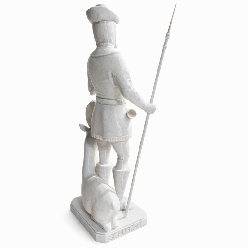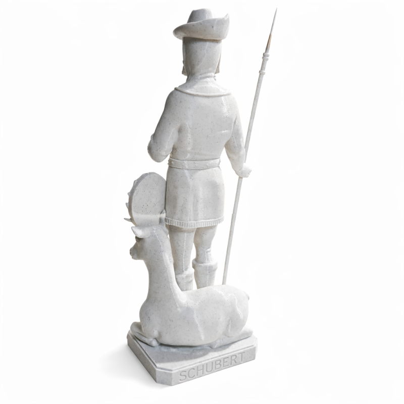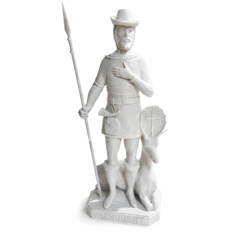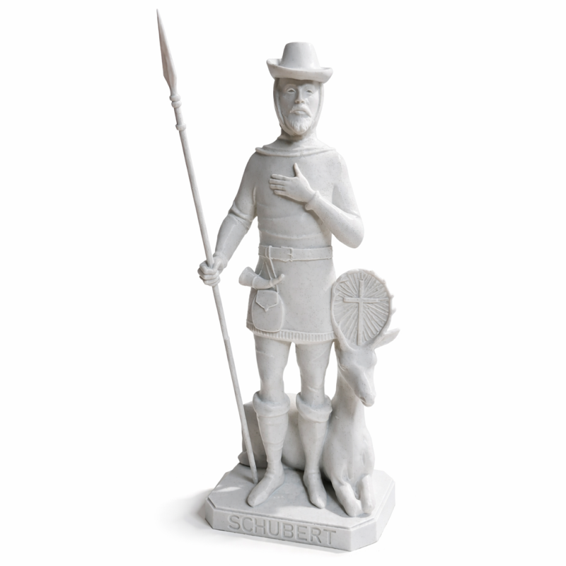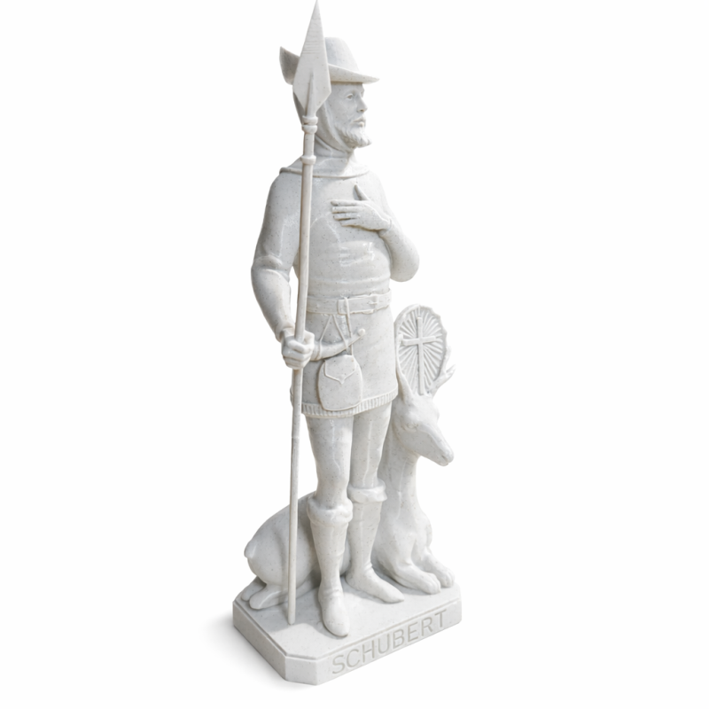 Ovaj detaljno izrađeni kip svetog Huberta prikazuje ga kao zaštitnika lovaca, šumara i ljubitelja prirode. Sveti Hubert prikazan je u tradicionalnoj lovačkoj odjeći, s kopljem u ruci i jelenom uz noge, što je uobičajen ikonografski prikaz u katoličkoj tradiciji. Kip je izrađen 3D tehnologijom od PLA materijala, što omogućuje precizne linije, čistu strukturu i dugotrajnost. PLA je čvrst, lagan i ekološki prihvatljiv biopolimer, idealan za dekorativne religiozne predmete. Površina kipa je glatka i ujednačena, s jasno definiranim detaljima poput odjeće, pribora i natpisa "St HUBERT" na postolju.