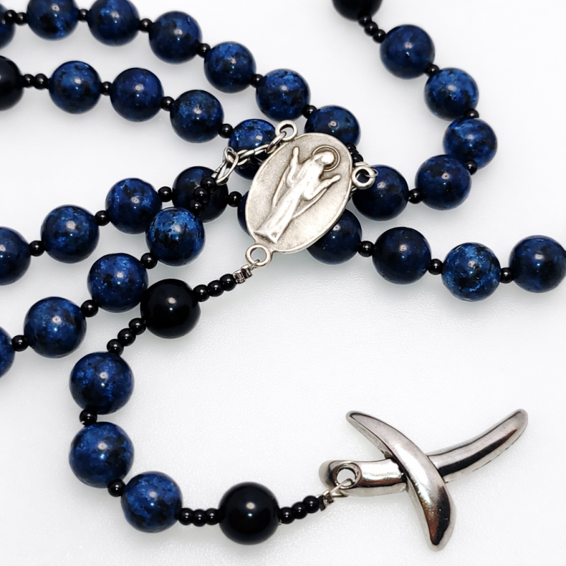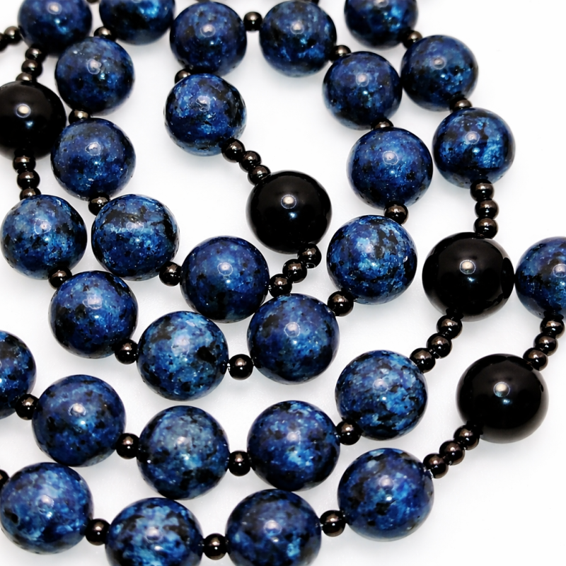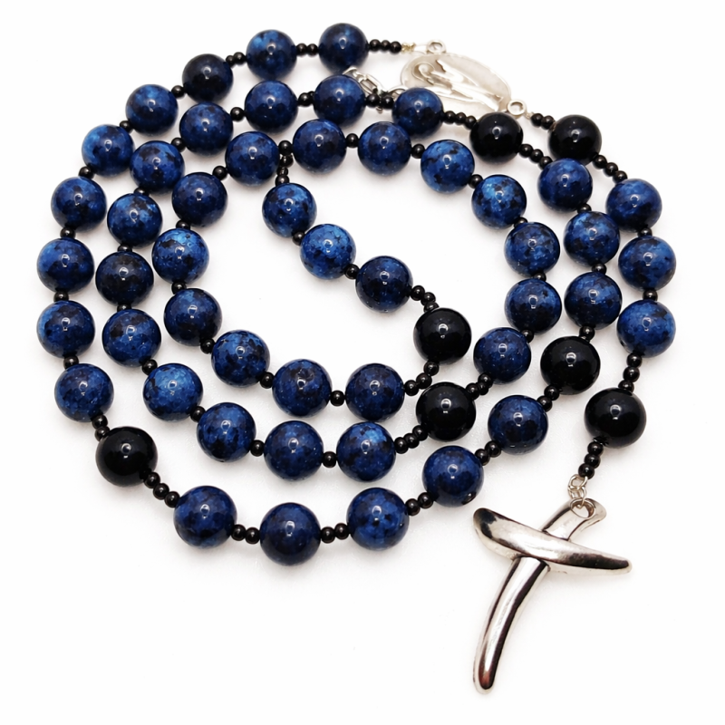 Elegantan spoj neba i zemlje koji daje snagu i ljepotu s našom Velikom krunicom izrađenom od prirodnog poludragog kamena Plavog Jaspisa i Oniksa s perlama promjera čak 10mm. Ova jedinstvena krunica kombinira duhovno značenje s estetskom privlačnošću, idealna je za osobnu molitvu i kao dar za dragu osobu.
