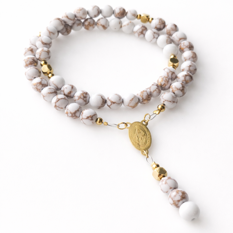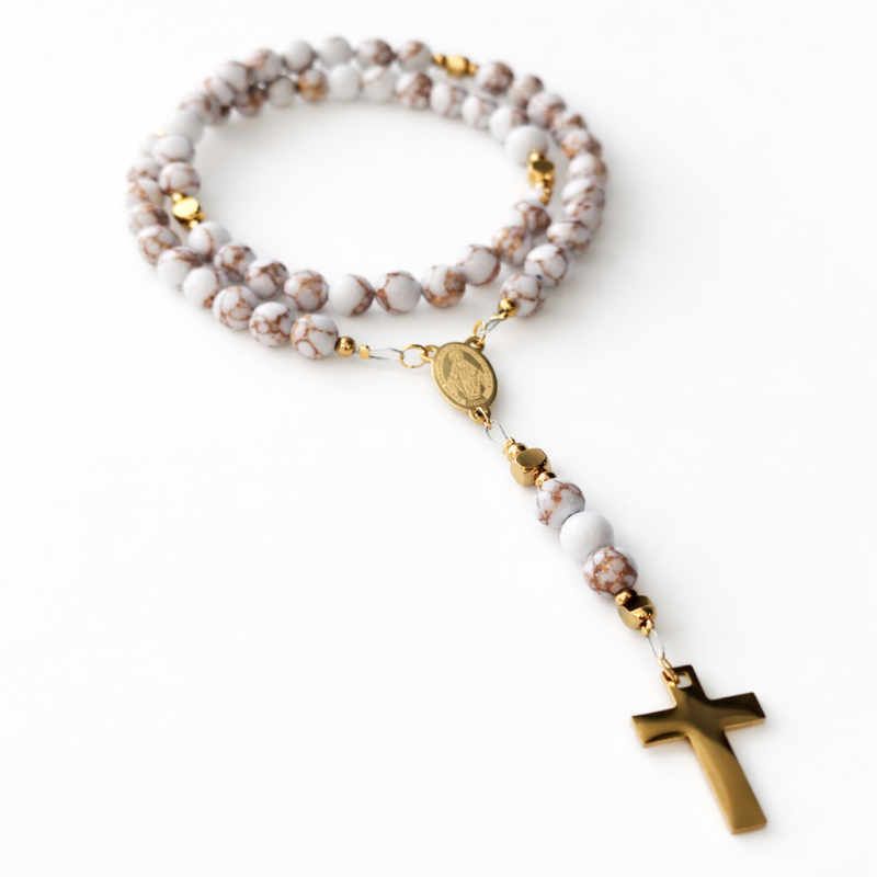 Elegantna katolička krunica pažljivo ručno izrađena od prirodnog zlatnog haulita – poludragog kamena sa jedinstvenom bijelo-smeđom, mramorno-poprečno žilastom teksturom koja odaje plemenit i profinjen izgled.