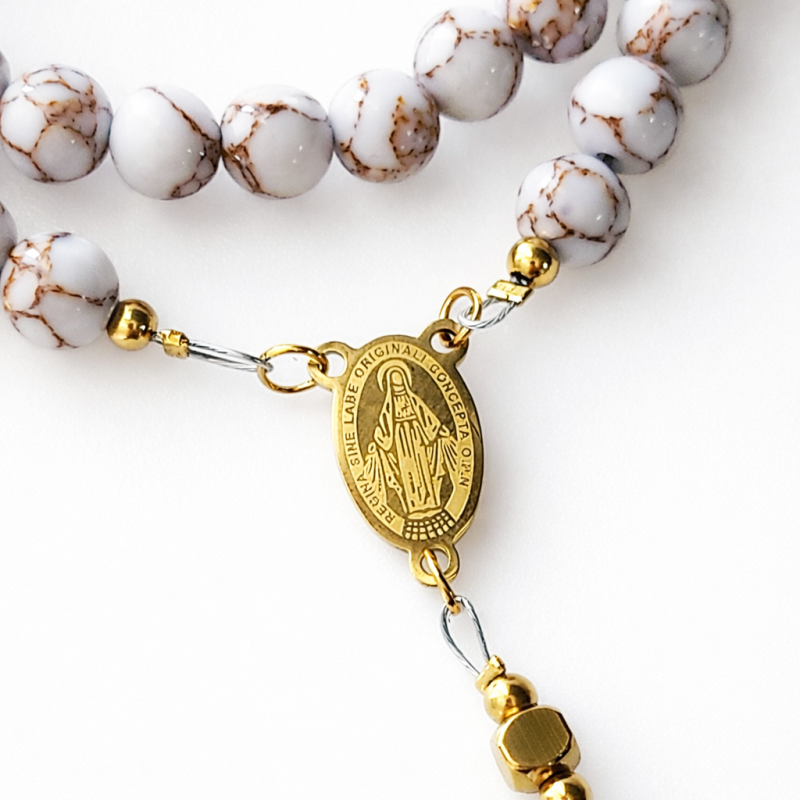Elegantna katolička krunica izrađena od perli prirodnog zlatnog haulita promjera 6mm, poznatog po svojoj jedinstvenoj bijelo-smeđoj strukturi koja podsjeća na mramor. Spojna medaljica prikazuje lik Bezgrešne Blažene Djevice Marije, poznatu kao Čudotvorna medaljica, dok je križ izrađen od kvalitetnog pozlaćenog nehrđajućeg čelika, koji osigurava dugotrajnost i postojan sjaj. Ova krunica je prikladna za svakodnevnu molitvu, kao i za poseban dar povodom sakramenata ili važnih životnih trenutaka.