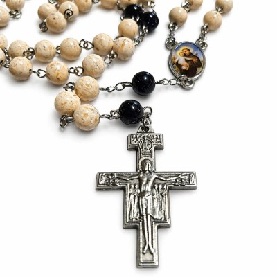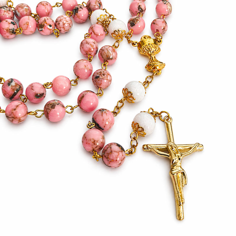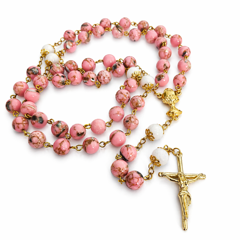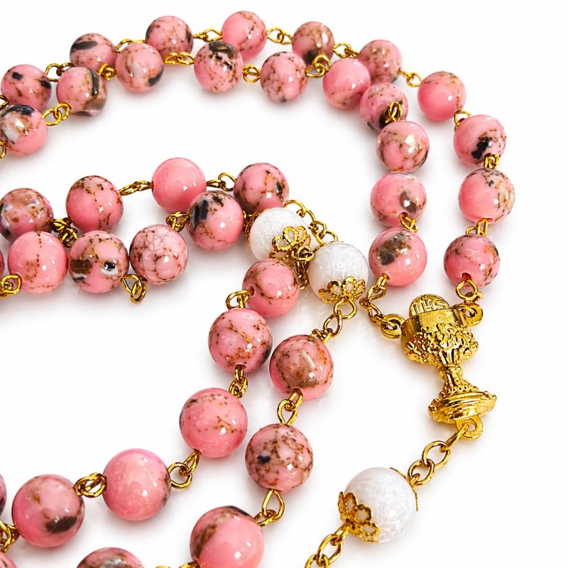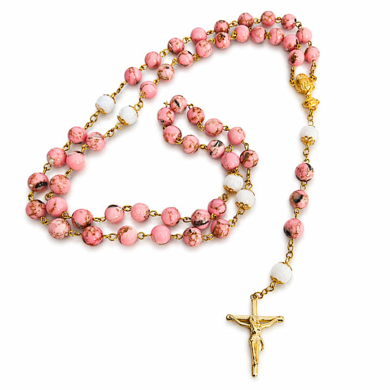 Roza nijansa perli daje ovoj krunici posebno blag i skladan izgled, dok tekstura haulita i sjaj bijelih porculanskih perli stvaraju lijep vizualni kontrast. Pozlaćeni elementi dodatno naglašavaju svečanost izrade i čine ovu krunicu prikladnom za osobnu molitvu, darivanje ili kao poseban vjerski poklon za sakramentalne prigode.