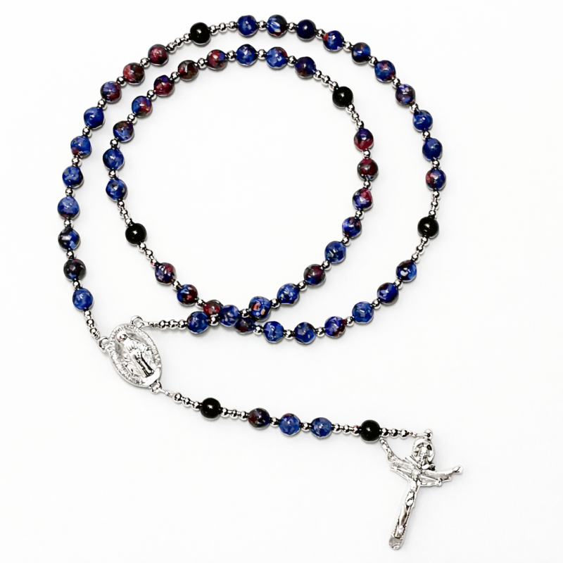 Ručno rađena Gospina krunica od poludragog kamenja i metalnih komponenti. Po želji kupca može biti personalizirana ili ne. Napravljena je s kopčom pa se može nositi i oko vrata.
