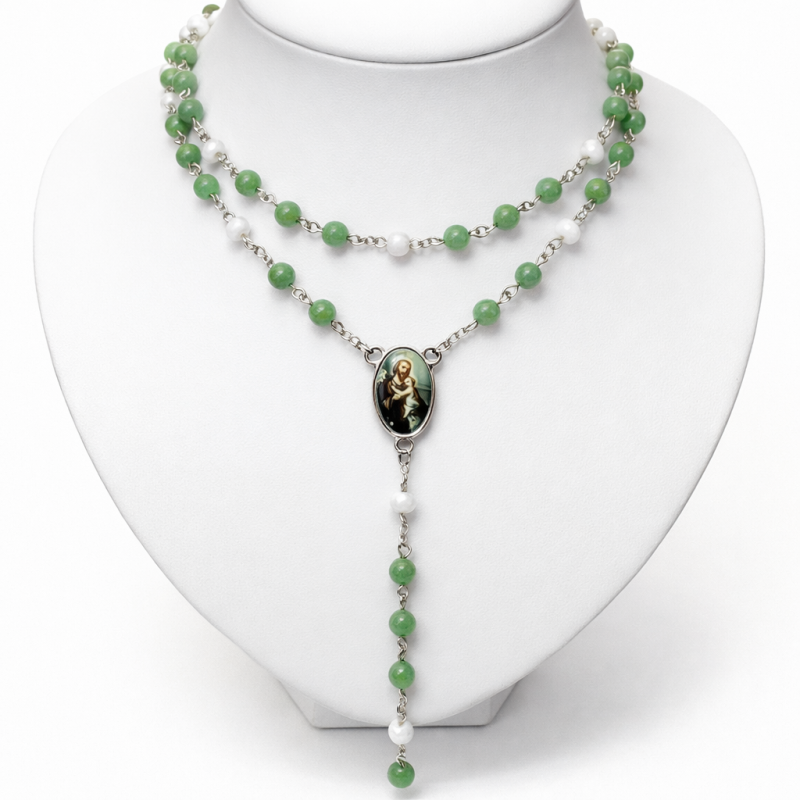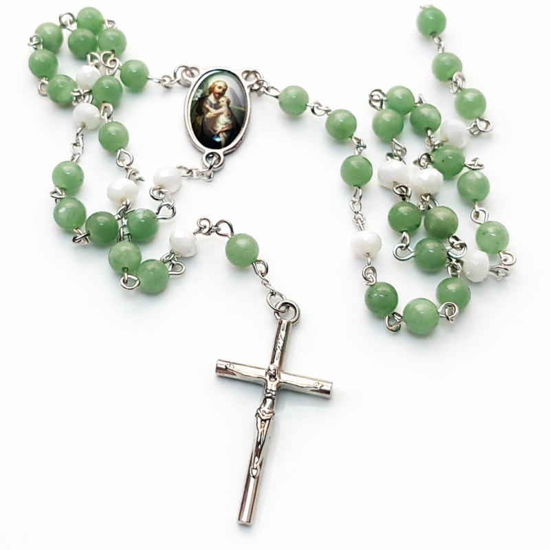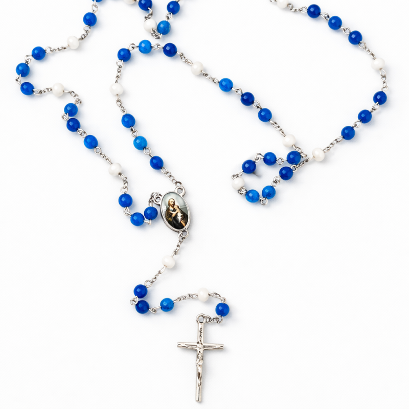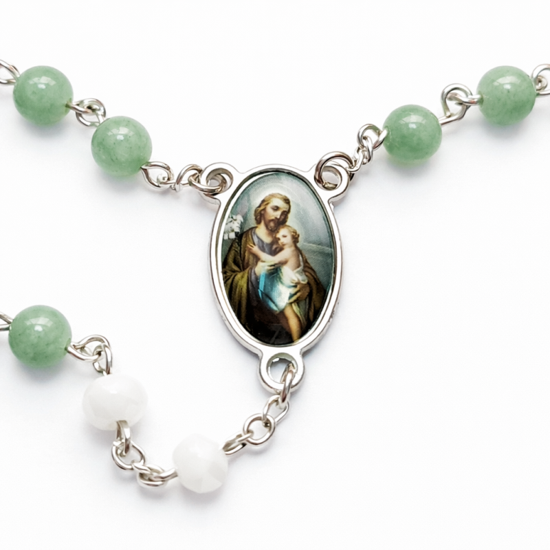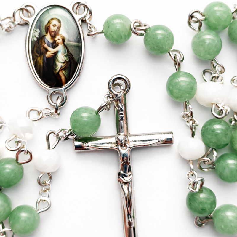 Krunica svetog Josipa ručno je izrađena kao katolički molitveni predmet namijenjen svakodnevnoj uporabi, osobnoj molitvi i darivanju u posebnim prigodama. Dostupna je u varijantama od poludragog kamena plavog ahata ili aventurina, uz dodatak češkog kristala i metalnih komponenti od legure. Skladan izgled, pažljivo odabrani materijali i ručna izrada čine ovu krunicu lijepim izborom za osobnu pobožnost, dar za dragu osobu ili trajnu uspomenu uz sakramentalne i obiteljske prigode.
