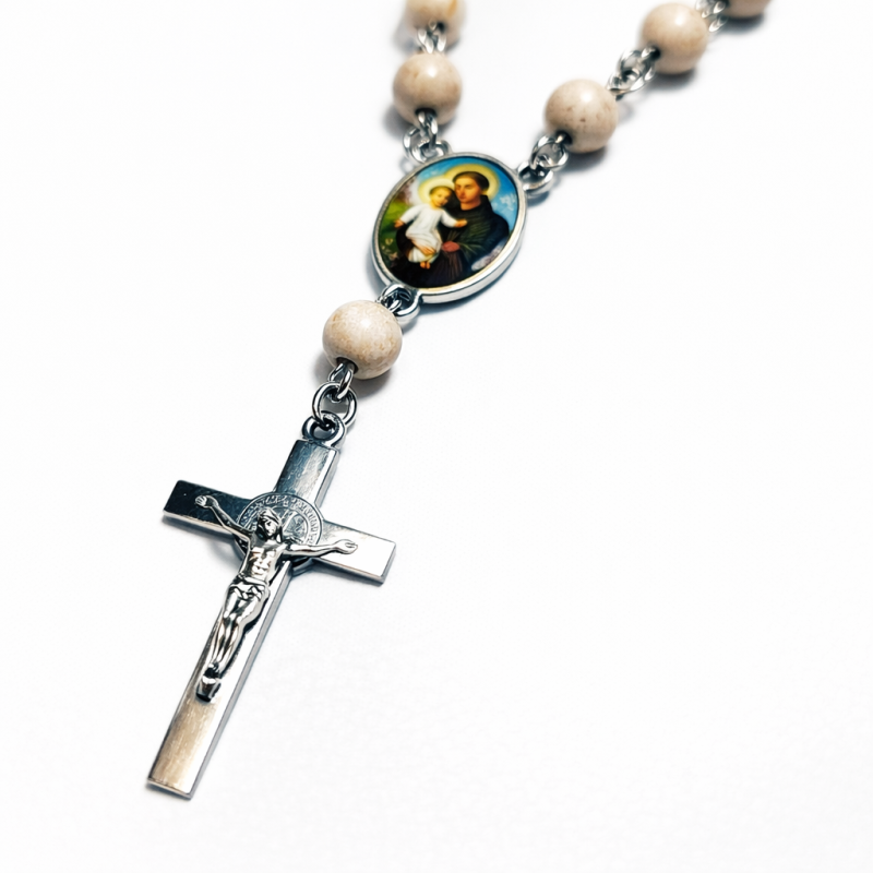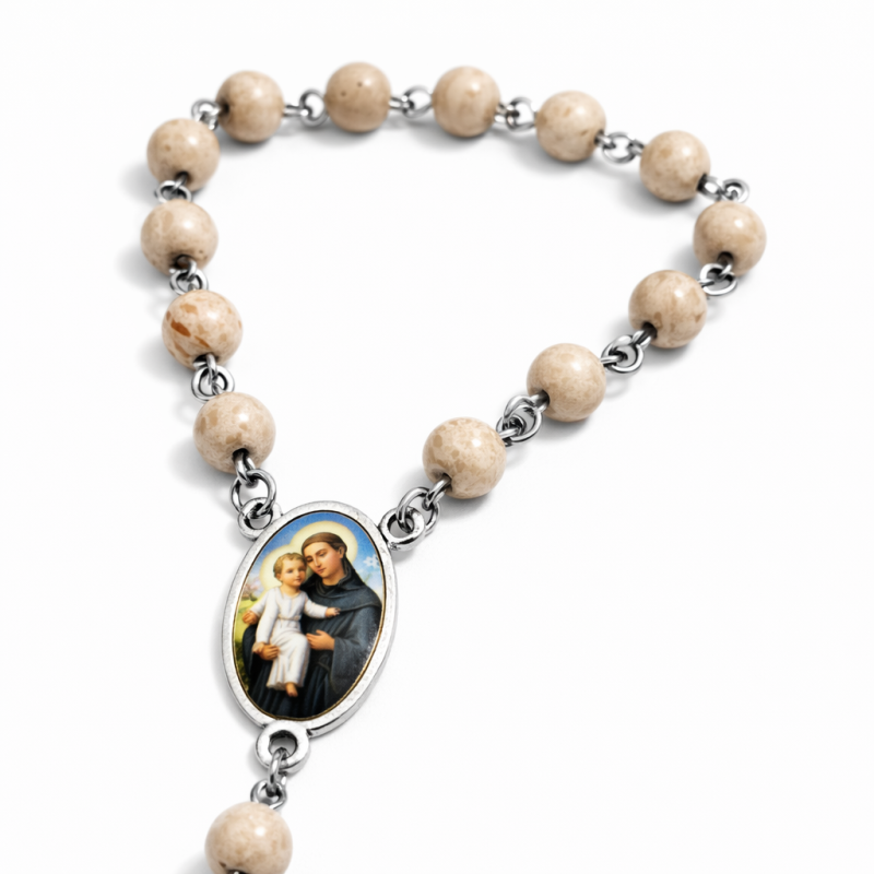 Ova krunica posvećena svetom Antunu izrađena je od bračkog kamena. Kratka krunica je praktična i savršena za svakodnevnu molitvu te se lako nosi u torbi ili džepu.