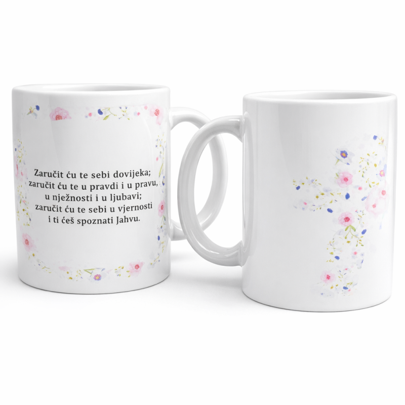 Šalica s citatom vašeg najdražeg sveca ili najdraže molitve s jedne strane te predivan križ s druge strane.