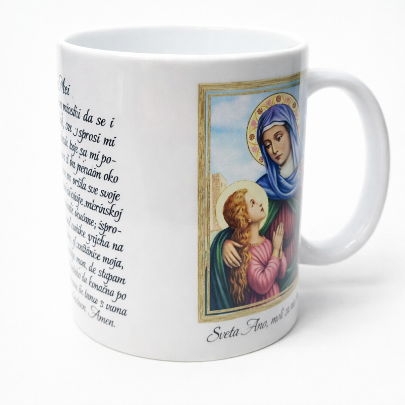 Započnite Svaki Dan s Blagoslovom - Šalica Sveta Ana s Jutarnjom Molitvom. Unesite mir i duhovnost u svoje jutro s našom prekrasnom šalicom "Sveta Ana s jutarnjom molitvom". Ova elegantna šalica kombinira praktičnost i inspiraciju, pružajući vam savršen način za početak dana.