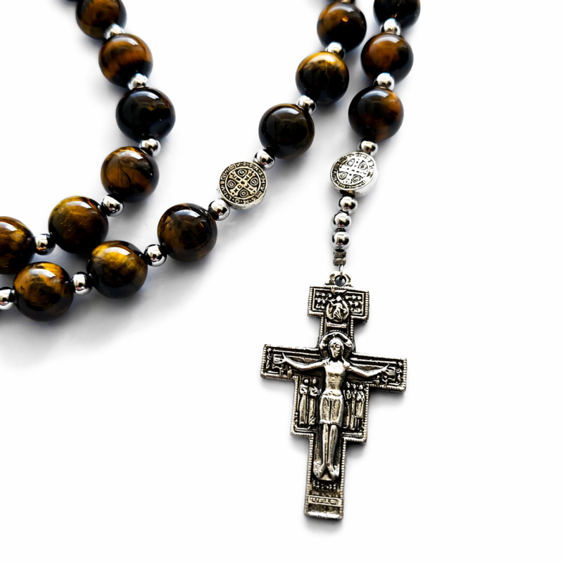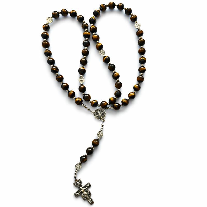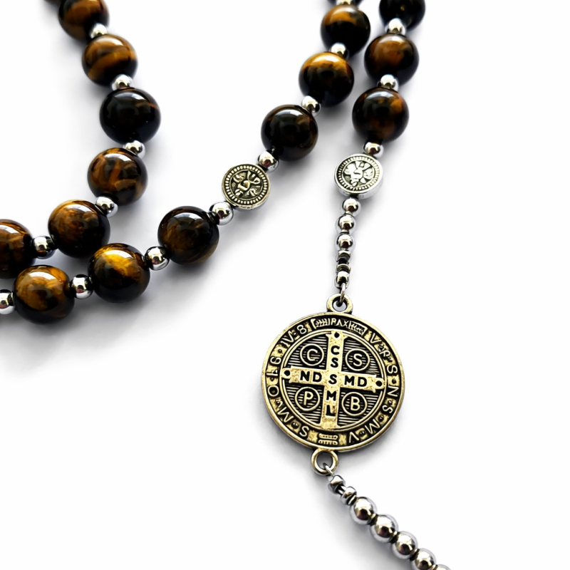 Otkrijte snagu i ljepotu s našom krunicom svetog Benedikta izrađenom od prirodnog poludragog kamena Tigrovo oko promjera 10mm. Ova jedinstvena krunica kombinira duhovno značenje s estetskom privlačnošću, idealna je za osobnu molitvu i kao dar za dragu osobu. Sadrži križ sa natpisom na latinskom: