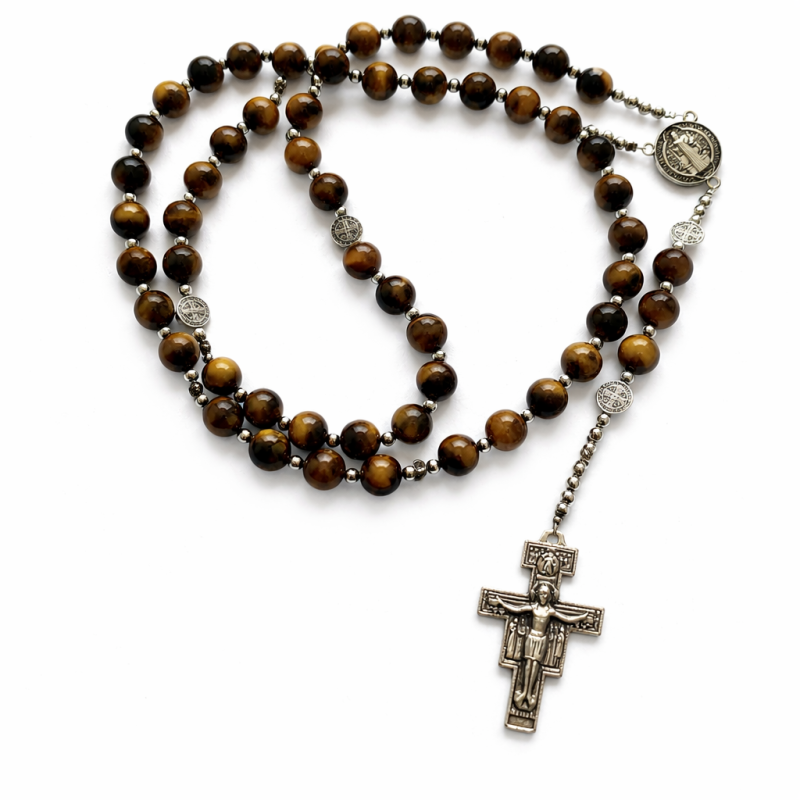Krunica svetog Benedikta od tigrovog oka spaja benediktinsku medaljicu, prirodan kamen toplih smeđih tonova i urednu izradu. Prikladna je...