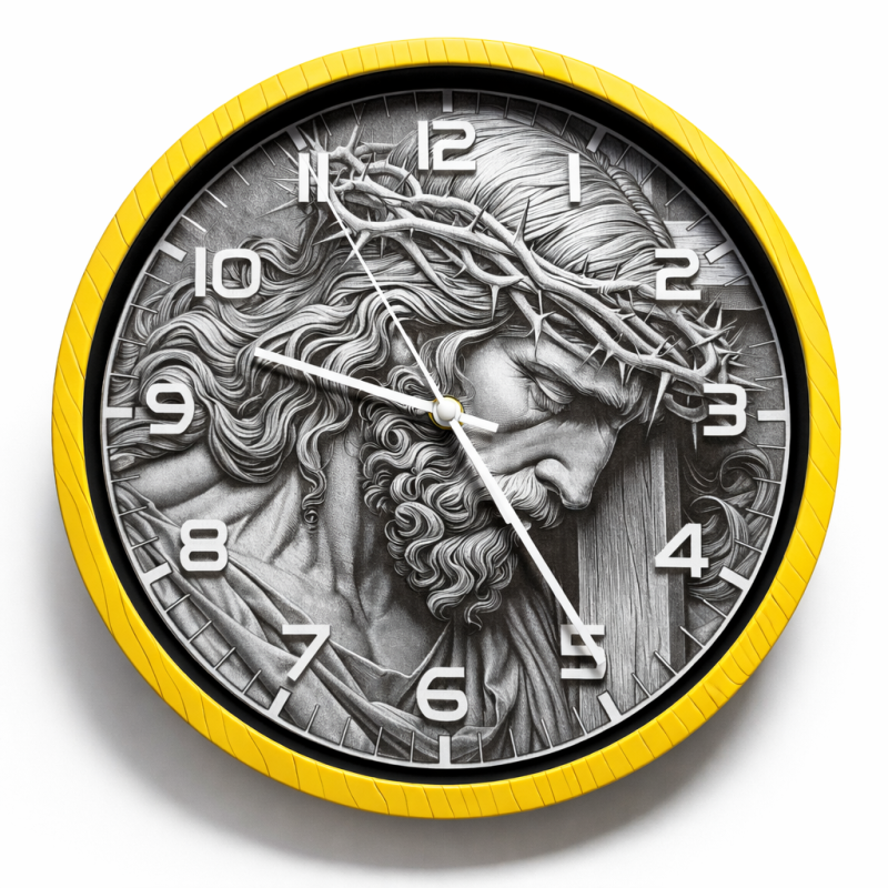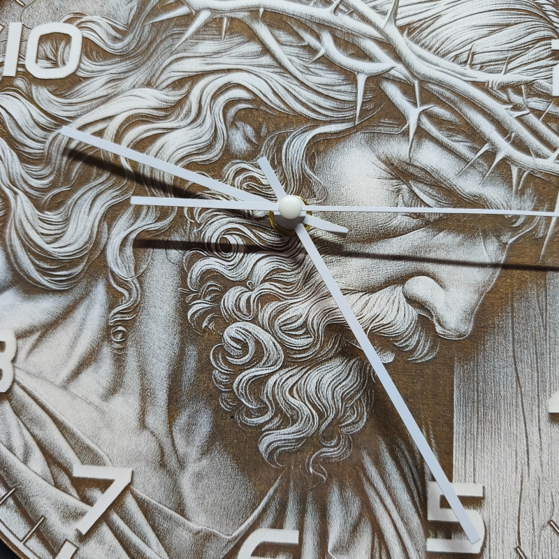 Ovaj dekorativni zidni sat s motivom Isusa Krista unosi u prostor posebnu ozbiljnost, mir i prepoznatljiv kršćanski karakter. Pažljivo izrađen kao funkcionalan i estetski detalj za dom, ured, molitveni kutak ili kao dar dragoj osobi, sat spaja korisnu svakodnevnu namjenu s dojmljivim vizualnim motivom koji podsjeća na Kristovu žrtvu, ljubav i otkupljenje.